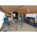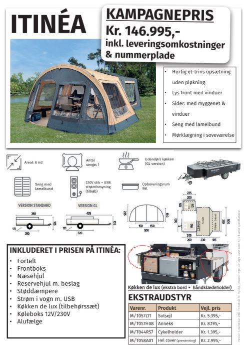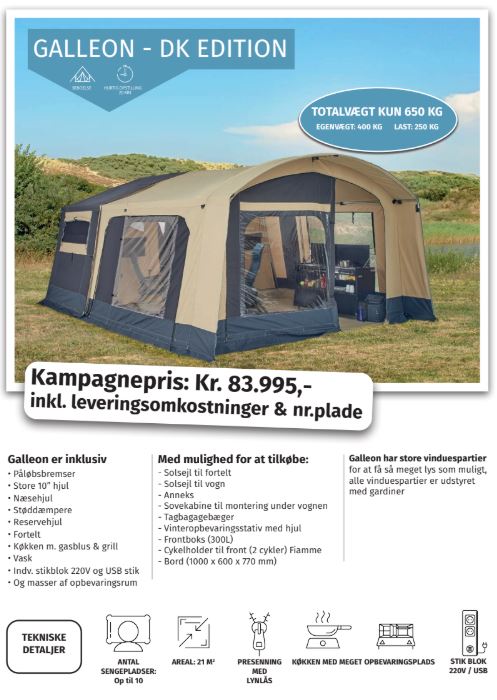 Inkl. Påløbsbremse, store 10" hjul, Næsehjul, Støddæmpere, Reservehjul, Fortelt, køkken med gasblus, Indv. stikblok 220 V og USB stik og masser af opbevaringsplads.